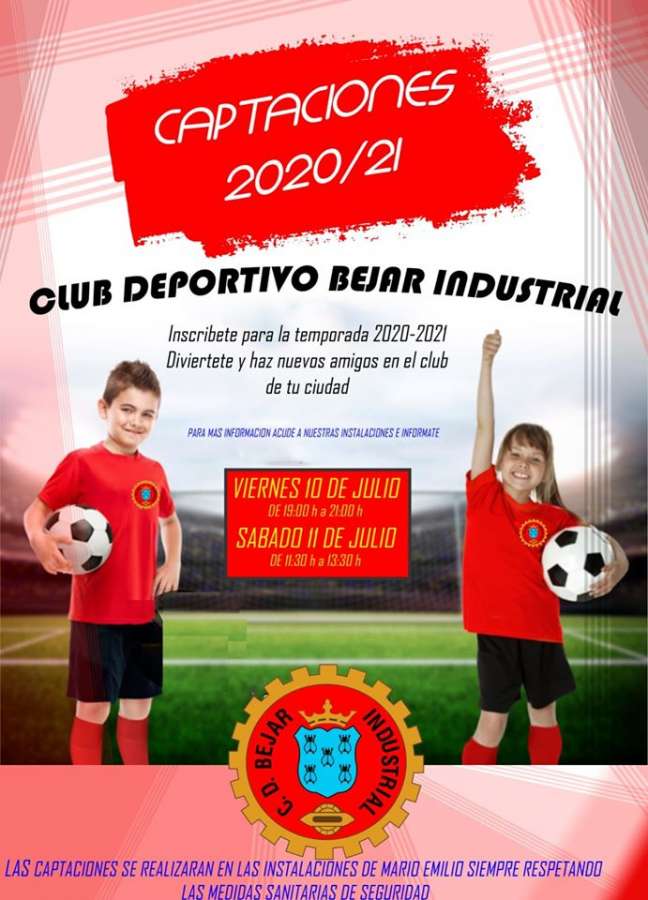 El club deportivo Béjar Industrial ha puesto en marcha una nueva campaña de captación de jugadores para su s equipos de la cantera. Las captaciones ere realizarán en las instalaciones deportivas de Mario Emilio, siempre con las oportunas medidas de seguridad.