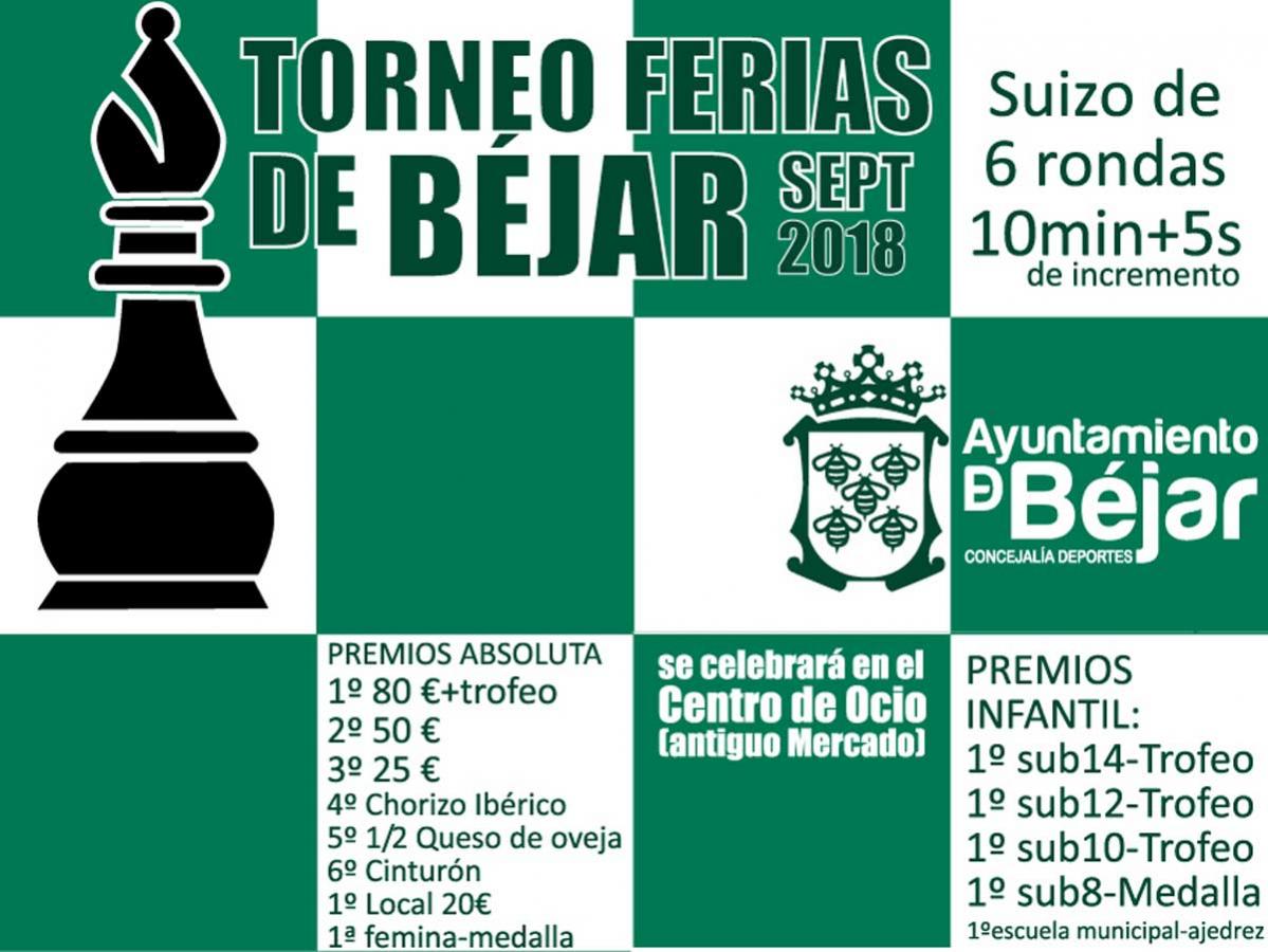 El Club de Ajedrez será el encargado de organizar el Torneo Ferias de Béjar de Ajedrez. El escenario será el Centro de Ocio, en la calle Mansilla,19. Se celebrará el sábado 22 de septiembre. La primera ronda está programada para las 17:30 h.