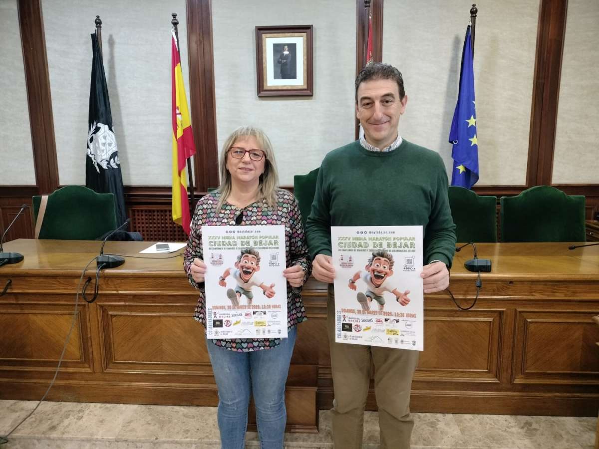 El concejal de Deportes de Béjar, Rubén Martín, y la presidenta del Club de Atletismo Bejarano “Embutidos Sierra de Béjar”, Carmen Hernández, han presentado la XXXV edición de la Media Maratón Popular “Ciudad de Béjar” y el XXI Campeonato de Bomberos/as y Fuerzas y Cuerpos de Seguridad.