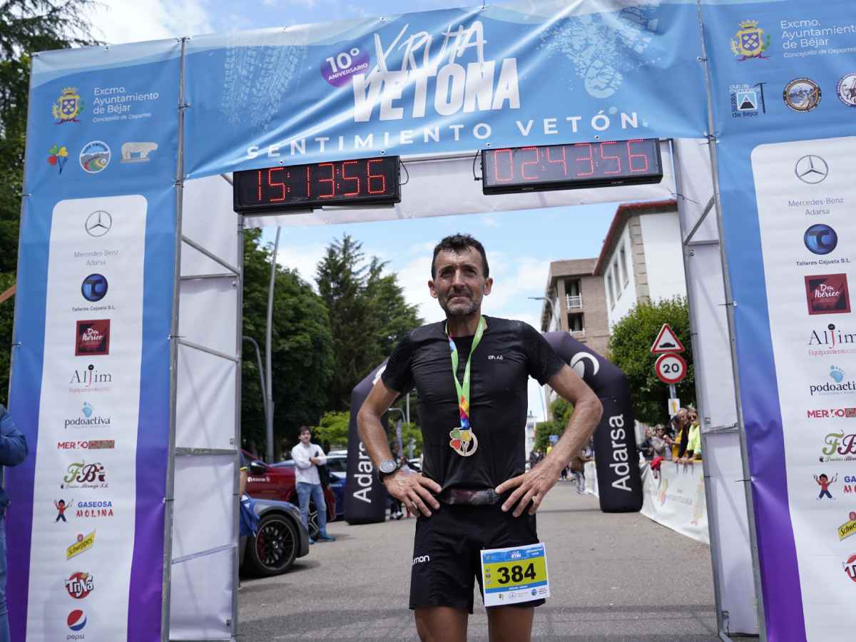 Hace tiempo que se agotaron los calificativos para describir los éxitos deportivos de Miguel Heras. A sus 47 años, lejos de acomodarse en su talento innato para competir, el corredor bejarano llegaba a la décima Ruta Vetona con la seria intención de batir su propio récord en la prueba de 42 kilómetros. Y lo logró. Cinco años después de hacer un crono de 2 horas y 45 minutos, Heras lograba restar 3 minutos a su marca y llegar a la línea de meta en 2h 42:58. Con un ritmo inferior a 4 min/km, «bailó» a lo largo del recorrido vetón para volver a añadir una nueva página de oro a su extenso palmarés. En el podio le escoltaron dos corredores de su mismo club, el 2007 Trail: Iván Bernardo ‘Pinxi’ (2h 55:11) y Manu Capitán (3h 03:16).
