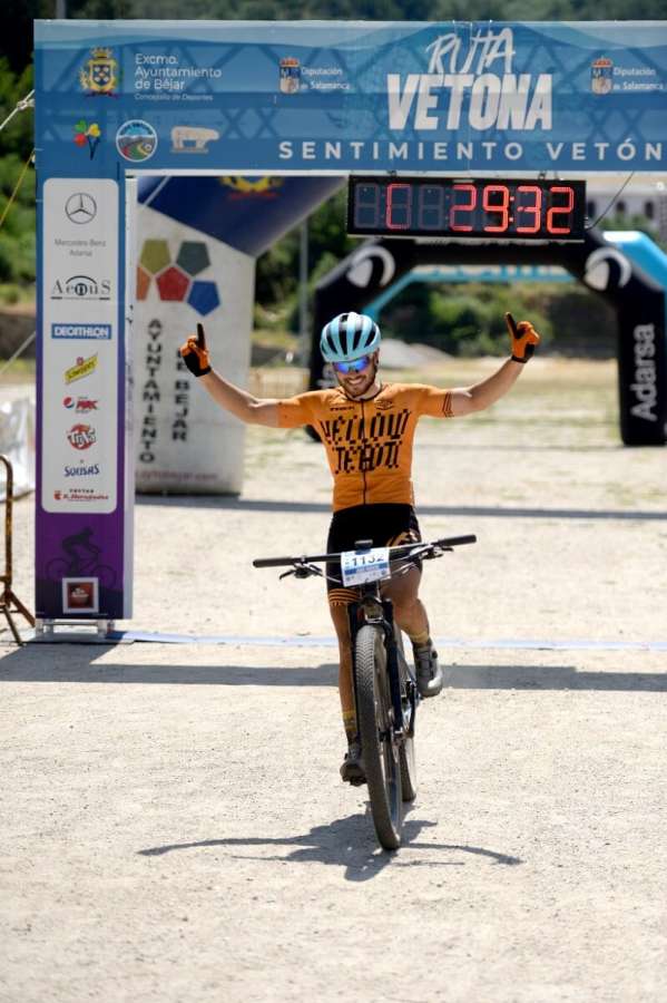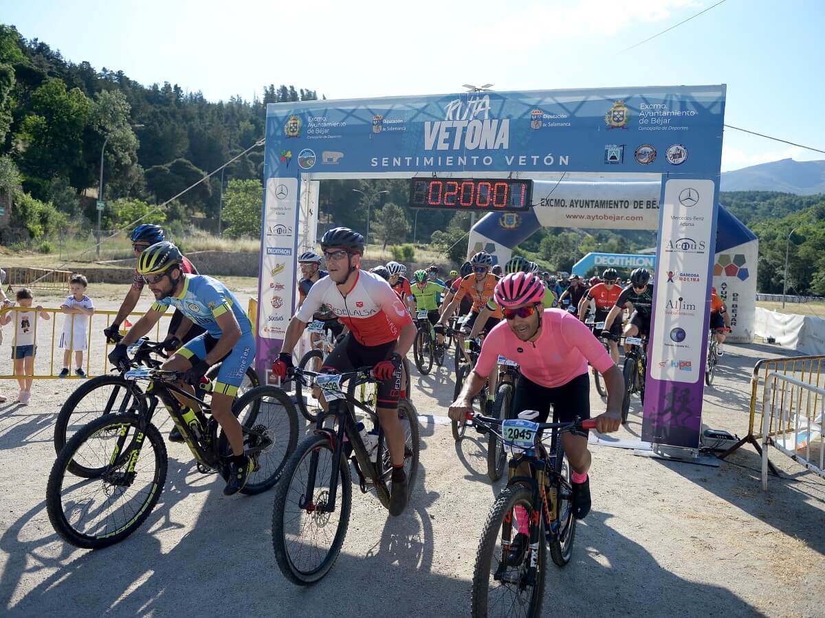 Tras la celebración de las carreras a pie de la novena edición de la Ruta Vetona el pasado 4 de junio, este sábado llegó el turno para los participantes de las modalidades de mountain bike. La ciudad de Béjar, en Salamanca, volvió a recibir a cientos de deportistas dispuestos a descubrir los caminos más emblemáticos de su comarca, aunque en este caso, sobre dos ruedas. Tras el fallido estreno de la prueba de 100 millas, el programa ofreció finalmente dos distancias: la clásica de 100 kilómetros y 2.550 metros de desnivel positivo que prácticamente comparte itinerario con la carrera a pie del sábado anterior, y la Mini Vetona MTB, que estrenaba trazado aumentando su recorrido hasta los 45 kilómetros.