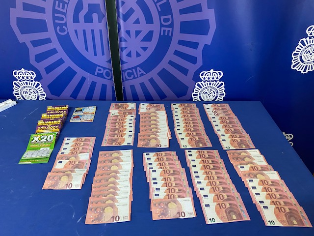 A la llegada de los agentes de Policía Nacional y tras el registro de seguridad que se le efectúa, se le encuentra dentro de la pernera del pantalón billetes escondidos. Posteriormente y de la ropa interior, el detenido extrae más billetes, hasta un total de 87 de 10 euros.