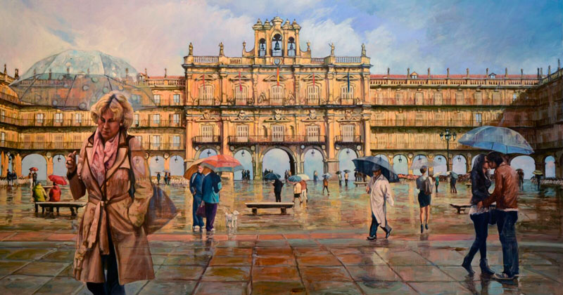 Los temas de paraguas, los reflejos y las composiciones entre lo expresivo e ilustrativo definen su obra. En ella lo fotográfico y lo irreal se acoplan. La unión entre la arquitectura clásica, el edificio histórico, con lo humano en un juego plástico y surrealista como si tal fuere un pequeño escenario teatral, constituyen el encuadre plástico de sus obras.