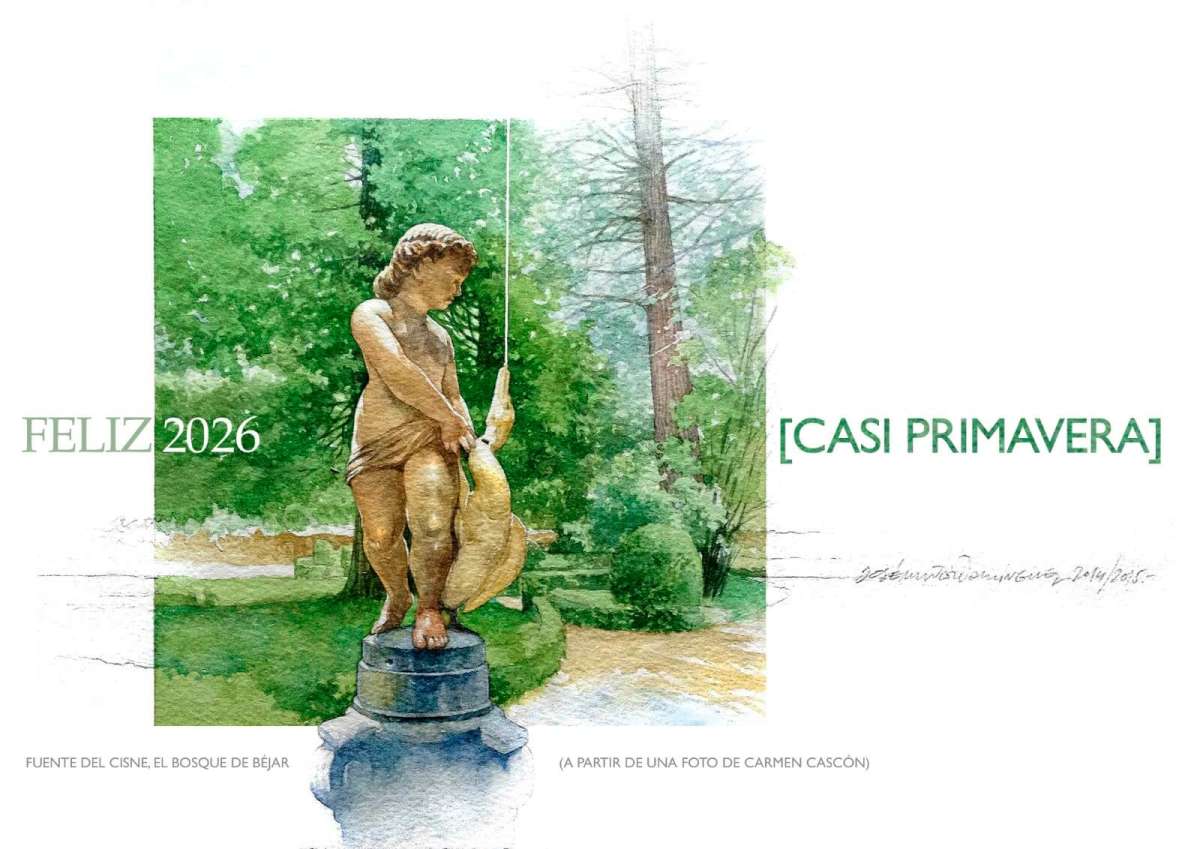 Desde mi refugio bejarano deseo feliz 2026 a todos los lectores de i-bejar.com con esta postalica de Año Nuevo, acuarela bosquera realizada a partir de una foto de Carmen Cascón Matas, con la promesa cierta de la primavera desde el último solsticio.