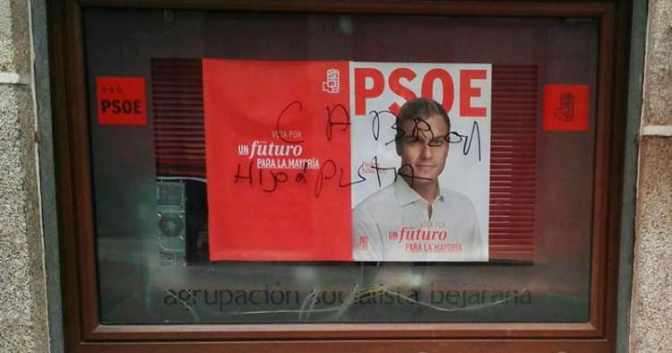 "Cabrón hijoputa", las últimas pintadas ofensivas se realizaron sobre el cartel del secretario general, Pedro Sánchez, que preside el escaparate de la sede.
